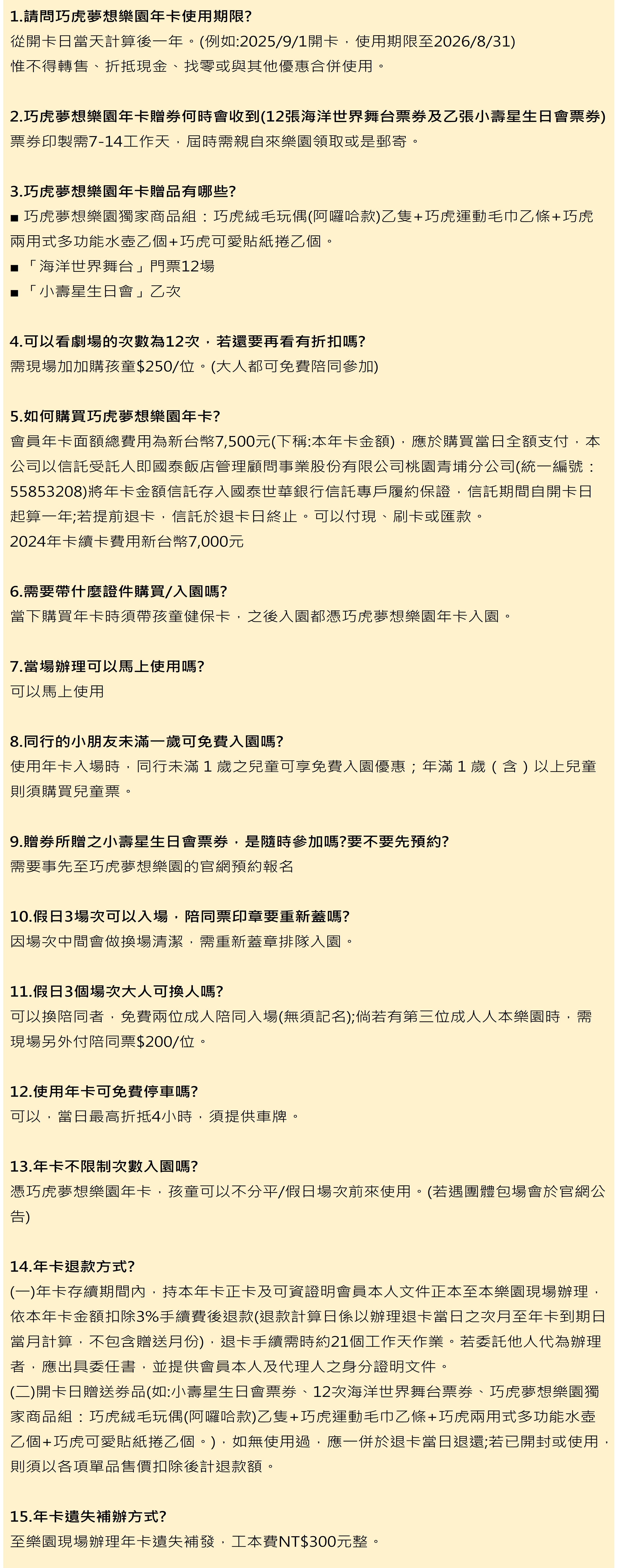 巧虎夢想樂園獨家專屬樂園年卡相關事項Q&A